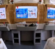Business class still features a traditional layout with 7 seats per row. This means the passengers at the windows or the middle seat will have a harder time getting out to the aisle when their neighbour has their seat in a sleeping position. Privacy is also limited. The seats are comfortable and offer a lie-flat sleeping position. The seats feature 17" entertainment screens, USB ports and power outlets. WiFi is also available. The exit area that separates the two cabins houses a lounge with refreshments and snacks.